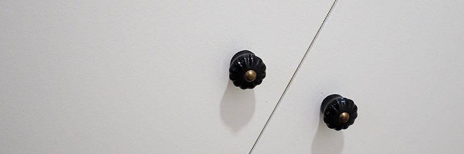 Kun kaikki kaksi maalikerrosta oli ovista kuivunut, asennettiin ne takaisin paikoilleen ja ruuvattiin uudet vetimetkin kiinni. Vetimet löysin yhdestä paikallisesta sisustusliikkeestä, mutta näin vastaavia myöhemmin myös Indiskassa.