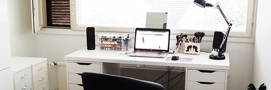 Nautin, että mulla on vihdoinkin näin tyhjä työpöytä! Nyt sitä jopa ihmettelee, että miksi en tehnyt tätä ratkaisua aikaisemmin, mutta olihan ne vetolaatikot kyllä kätevät siinä edellisessäkin pöydässä, kun meikkaamista ajattelee: kaikki oli heti näkyvillä. Nyt jouduin jakamaan meikit kategorioittain viiteen eri laatikkoon, että sain kaiken järkevästi saataville, mutta teen meikkilaatikoista oman postauksen joskus myöhemmin, kun saan ne järjestettyä paremmin.