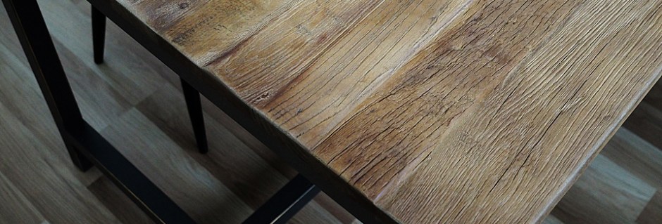 Pöydässä on metallinen runko ja vanhaa (tai ainakin vanhan näköistä) puulankkua tuo pöydänkansi, juuri tismalleen sellainen, kuin haluttiinkin.  Suunnilleen huokailen vaan ihastuksesta, kun käyn keittiössä tai kun syön uuden pöydän ääressä :D Kyllä nyt kelpaa pyytää ihmisiä kylään syömään!