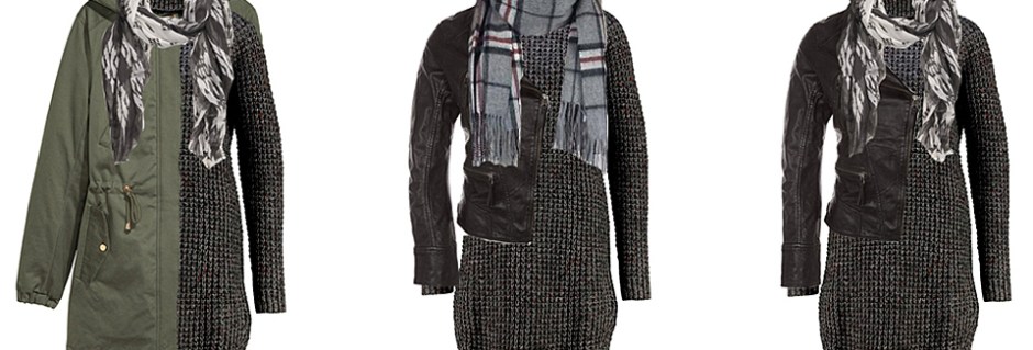 Ensimmäinen kollaasi on toteutettu niin, että perustana on pidempi tummanharmaa paksu neulepaita/mekko.