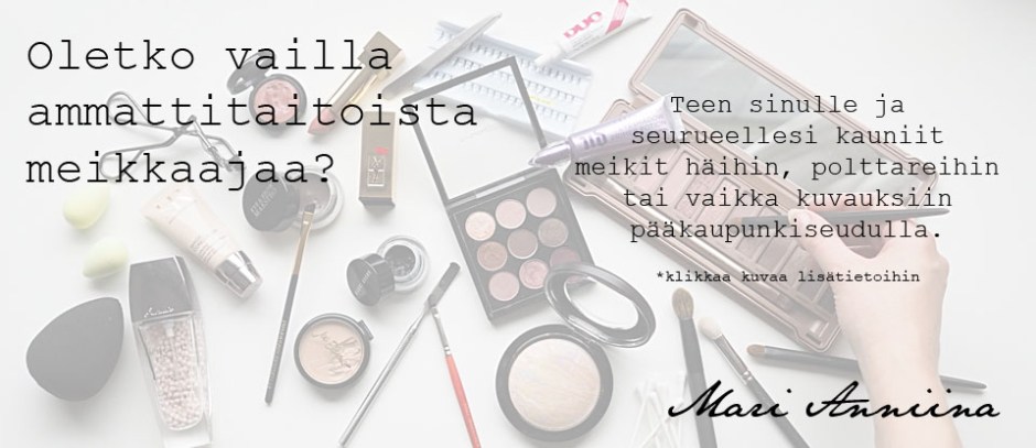 Oletko vailla ammattitaitoista meikkaajaa? Teen sivutyönä meikkikeikkaa yksityishenkilöille pääkaupunkiseudun alueella (julkisen liikenteen varassa). Olen työskennellyt kauneusalalla vuodesta 2004 ja olen tehnyt meikkauksia useampia satoja per vuosi nykyisen päivätyöni parissa ja myös omia meikkikeikkoja.
