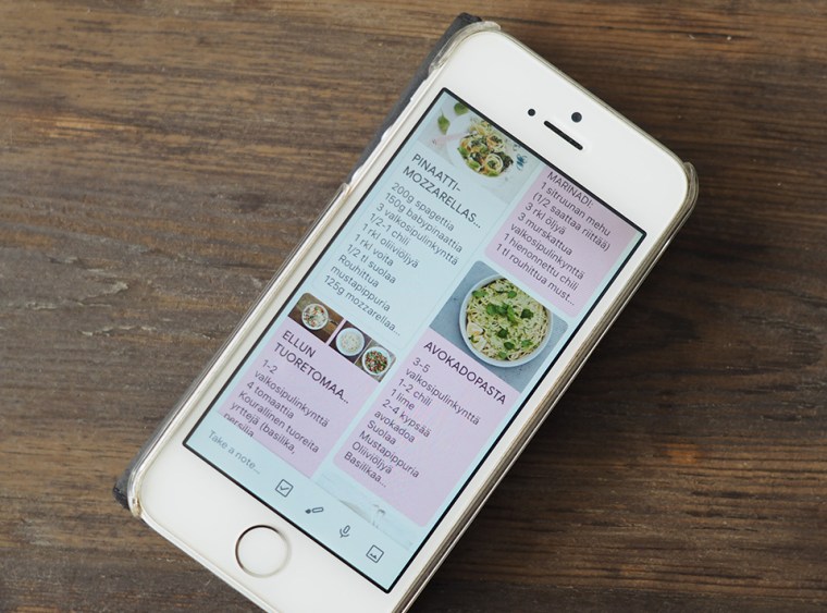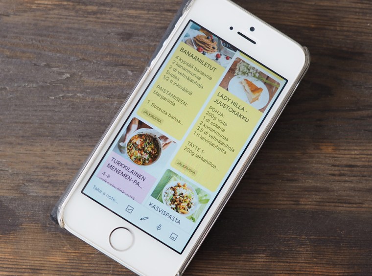 Noh! Mähän sitten ratkaisin tämän ongelman sillä, että latasin tämmöisen Google Keep -apin kännykkään. Appi on siis melko yksinkertainen muistilappu-appi, johon voi tehdä mitä tahansa muistiinpanoja. Olen käyttänyt useita iltoja ja pätkiä vapaapäivistä siihen, että olen kerännyt tähän appiin mun lempparireseptejä eri reseptikirjoista ja täydennellyt sinne ajan kanssa netistä löytyneitä uusia mielenkiintoisia reseptejä.