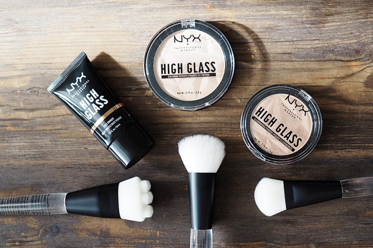 NYX High Glass -linjaan kuuluu kolme kasvoille tulevaa tuotetta ja niiden levitykseen suunnitellut siveltimet (synteettisiä): *Face Primer (mulla sävy 02 Rose Quartz), *Finishing Powder (mulla sävy 001 Light) ja *Illuminating Powder (mulla sävy 01 Moon Glow). Yllä kuvassa vasemmalla oleva *pympylä-suti on tarkoitettu primerille, keskimmäinen *isompi puuterille ja oikealla oleva *pienempi valopuuterille.