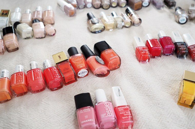Aluksi jaottelin kynsilakat karkeasti väreittäin sängylle ja nostin jokaisen käteen ja mietiskelin, että tykkäänkö käyttää ennemmin tätä vai tätä korallin väristä kynsilakkaa ja pikkuhiljaa osa kynsilakoista päätyi poistoläjään. Toisinaan valitsin kahdesta hyvästä sen, jonka brändistä tykkään enemmän tai sen, jossa on parempi sivellin. Osa jäi ihan vain siksi, että ovat limited edition -kokoelmista ja osa siksi, että niillä on tunnearvoa.