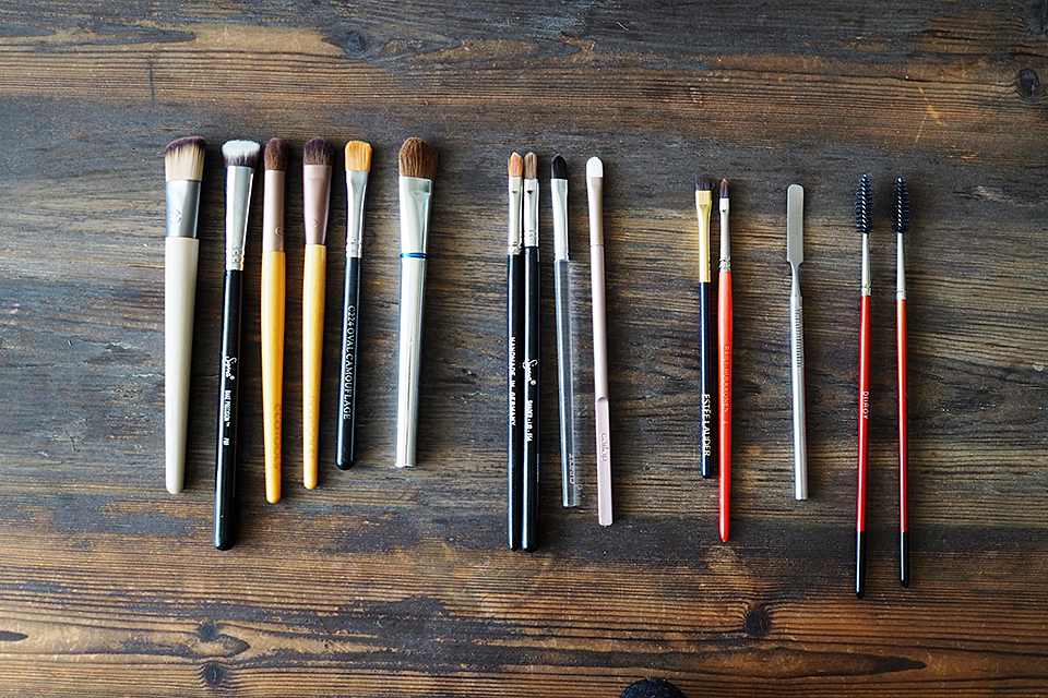 Monilla ammattimeikkaajilla saattaa olla keikoilla jopa moninkertainen määrä siveltimiä kuin mitä mulla on ja joillakin saattaa olla taas paljon vähemmän, riippuu tosi paljon tyypistä ja siitä millaisia keikkoja yleensä tekee. Mä teen lähes pelkästään hääkeikkoja tai muita isompia ryhmäjuttuja, joissa meikkaan 2-6 asiakasta saman (aamu)päivän aikana, jolloin tosiaan välillä saattaa olla tosi kova kiire. Kiireessä voin joutua skippaamaan joidenkin siveltimien väliputsauksen kokonaan, kun ei ole vain aikaa ja siksi olen todennut, että mulla on hyvä olla vaihtoehtoisia suteja samaan tarkoitukseen enemmänkin kuin vain pari lempparia.