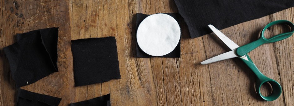 Kankaisten vanulappujen tekoon tarvitaan kangasta (itse valitsin mustaa bambutrikoota), sakset, muutama nuppineula ja yksi vanulappu mitaksi.