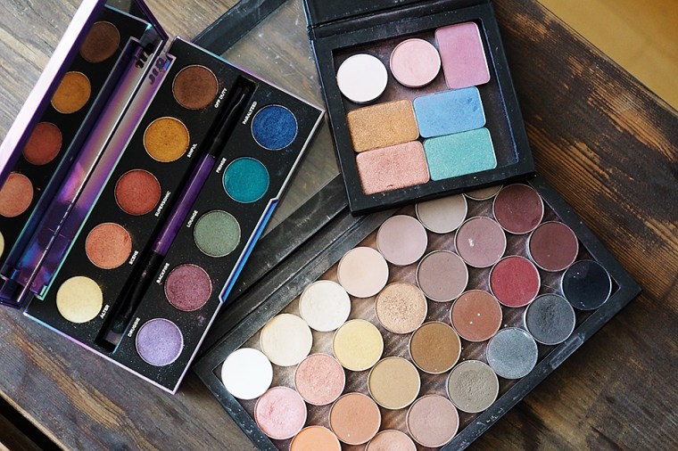 Luomiväripaletteja en ota kuin maksimissaan nämä kolme mukaan. 99% mä pärjään pelkästään tuolla itse kootulla isolla paletilla (josta postaus täällä), koska suunnilleen kaikki asiakkaat haluaa hillityillä neutraaleilla sävyillä tehdyn silmämeikin. Tuota räikeän väristä Urban Decayn palettia olen käyttänyt todella vähän, mutta tuosta pienestä Z-Paletesta olen kyllä käyttänyt noita vaaleita sävyjä. Mulla olisi haaveissa koota toinenkin iso Z-Palette, jossa olisi hieman enemmän värikkäitä sävyjä ja joitakin tietyntyyppisiä vaaleita lisää, mutta juuri tällä hetkellä en pysty siihen investoimaan.