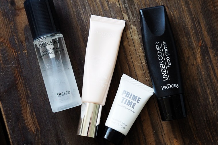 PRIMER. Kun silmät on tehty, siirryn kasvomeikin pariin. Ensin käytän yleensä jotain primeria. Useimmiten otan mukaan kaksi kosteuttavaa/hohtavaa ja kaksi mattaisempaa. Kosteuttavista Sensain vanha Smoothing Water Makeup Base on ihan ässä ja jos taas haluan kevyttä vaaleanpunertavaa shimmeriä iholle, käytän tuota Clarinsia (vanha versio nykyisistä SOS-primereista, vastaa samaa kuin *nykyinen 01-sävy niistä). Mun pitäis hankkia joku parempi mattaprimer pakkiin, mutta näillä olen toistaiseksi pärjäillyt, eli bareMineralsin Prime Time ja IsaDoran UnderCover.