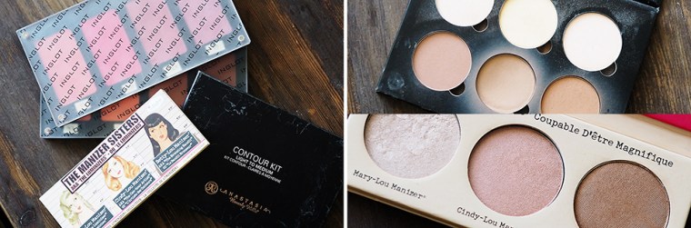 POSKET. Seuraavaksi siirryn kasvojen varjostuksiin, jotka teen yleensä *Anastasian Contour Kitillä (useimmiten käytän keskimmäistä sävyä Fawn). Jos asiakkaana on vanhempi rouva, käytän Anastasian paletista myös korostusväriä, koska ne ei ole yhtä hohtavia kuin The Balmin valopuuteri-triossa. Siitä käytän tottakai eniten tuota vaaleinta *Mary-Lou Manizeria, muita tulee käytettyä harvemmin, mutta on hyvä, että nekin on olemassa.