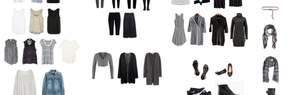 Päädyin aika simppeleihin vaatevalintoihin, joista suurinta osaa pystyy käyttämään ympäri vuoden. Valikoin tähän vain ne vaatteet, joita käytän ”yksinään”, eli lisäksi tulisi tietenkin alusvaatteita, pitkähihaisia aluspaitoja, alustoppeja, sukkia ja useammat sukkahousut ja legginsit jne, joilla pystyy kerrostamaan lämpöä talveksi. Tähän en myöskään ottanut mukaan kotivaatteita, juhlavaatteita enkä urheiluvaatteita, vaan ainoastaan vaatteet, joilla lähden ”ihmisten ilmoille” arkena.