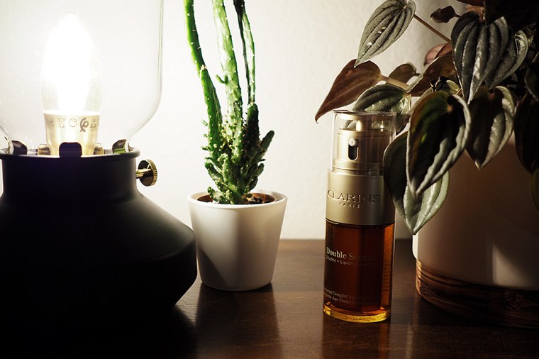 Toinen muutos, jonka tein, oli tämän *Clarins Double Serumin (saatu töiden kautta) siirtäminen pelkästä iltakäytöstä myös aamukäyttöön. Double Serum on tuote, jossa on sekä öljypohjainen että vesipohjainen seerumi samassa pullossa (eri sylintereissä), jotka tulee yhdellä pumppauksella samaan aikaan ulos. Tämä ravitseva anti-age seerumi on varmasti ollut myös tärkeä osa ihon kosteutusta kangasmaskin alla ja vaikka tässä on hieman öljyinen tunne levittäessä, ei iho silti jää öljyisen tuntuiseksi, kun seerumi ehtii hetken asettua paikoilleen. Olen syksyn aikana hölvännyt jo yhden pullon tyhjäksi, mutta onneksi oli jemmoissa vielä toinen samanlainen.