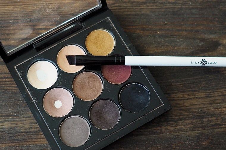 Käytin silmämeikkiin *MAC Semi-Sweet Times Nine -paletin sävyjä. Pohjalla mattainen vaalea (Drawing a Blanc), luomivaossa kevyenä varjostuksena ylärivistä keskimmäinen (Bamboo). Rajauksen teon aloitin alarivin keskimmäisellä sävyllä (Dance in the Dark) ja häivytin rajauksen yläreunaa samalla varjostusvärillä (Bamboo) kuin luomivaossa. Tein rajauksen viistopäisellä ja maailman pehmeimmällä *Lily Lolo Eye Liner-Smudge -siveltimellä.