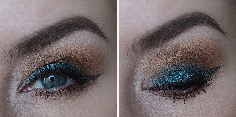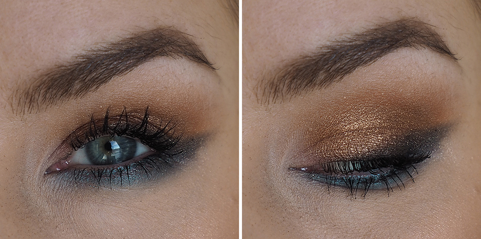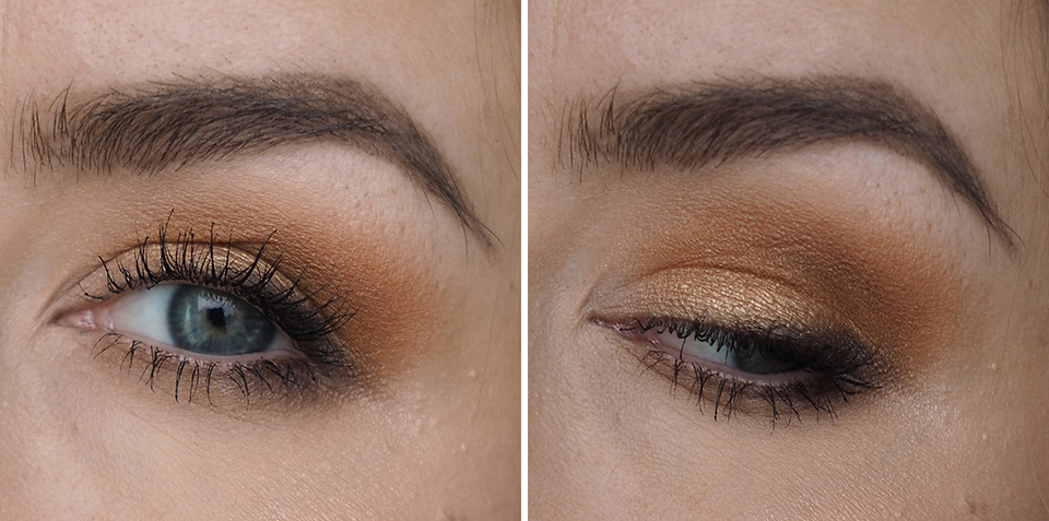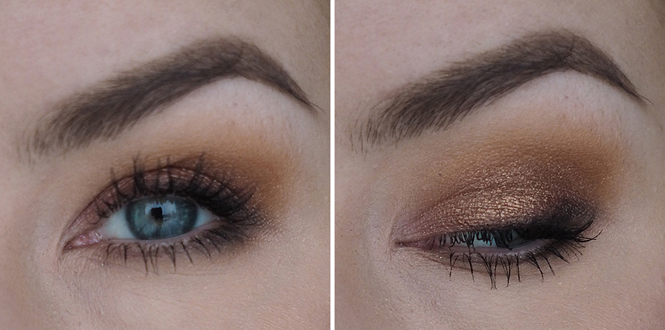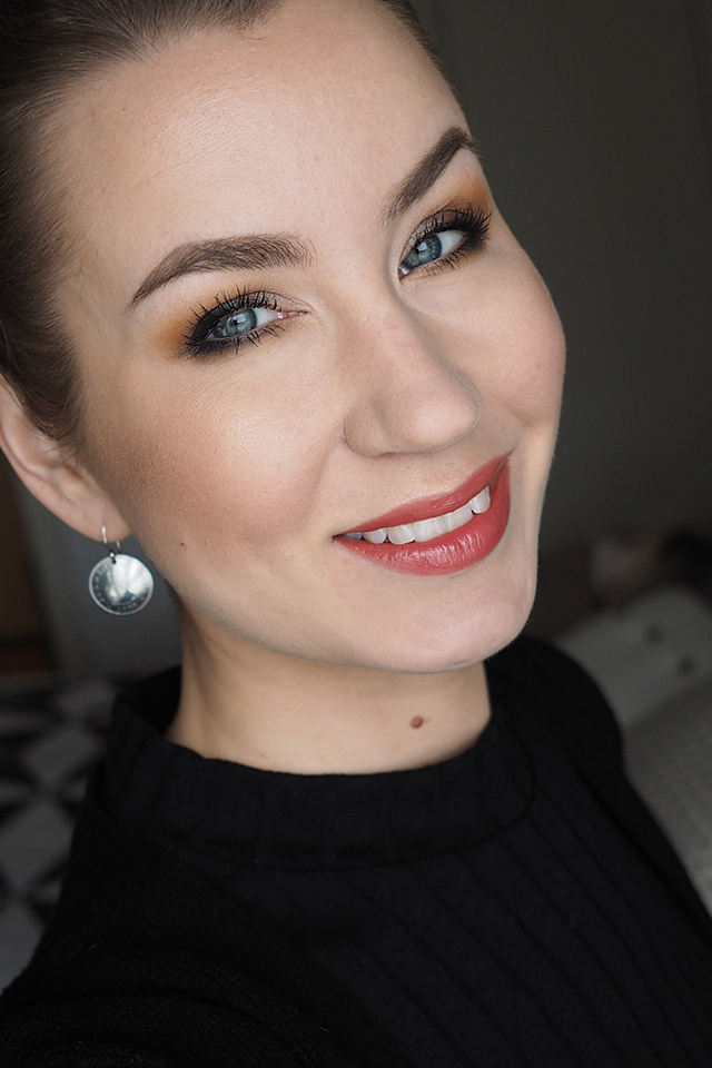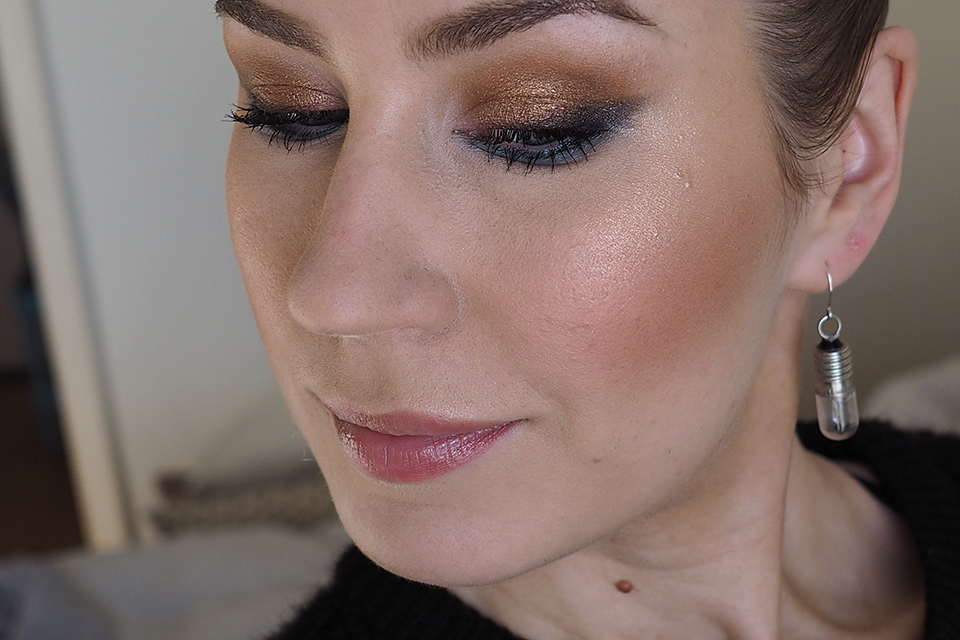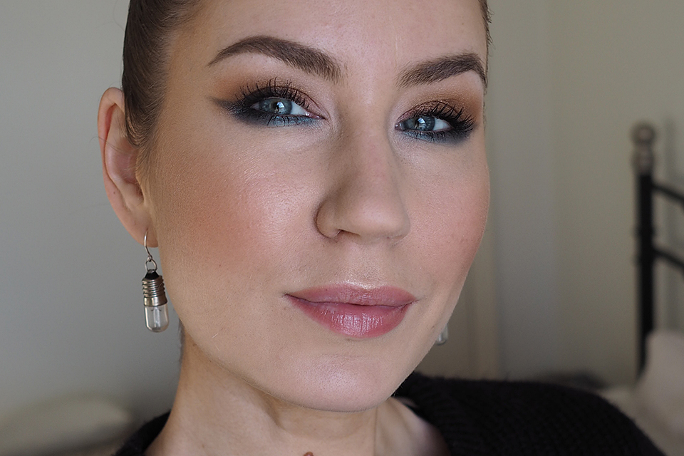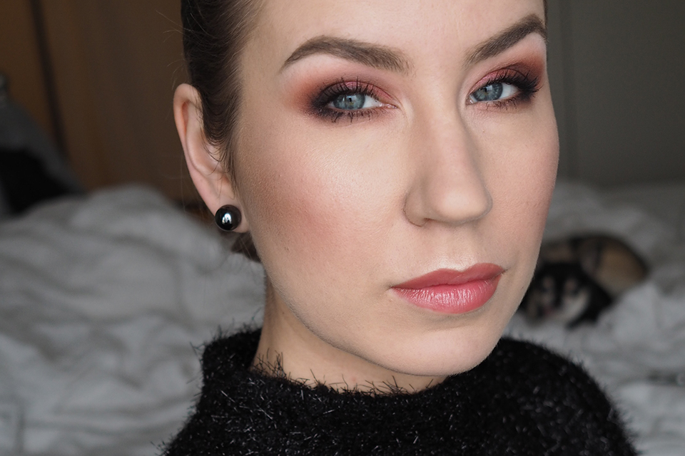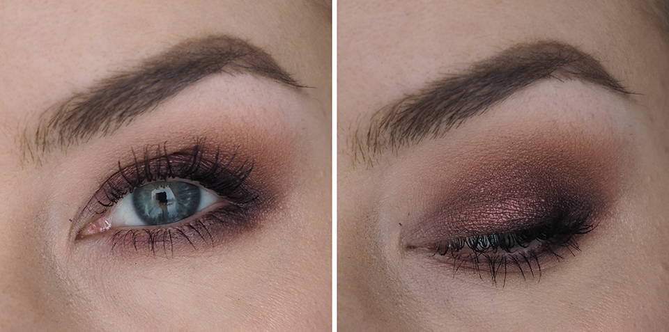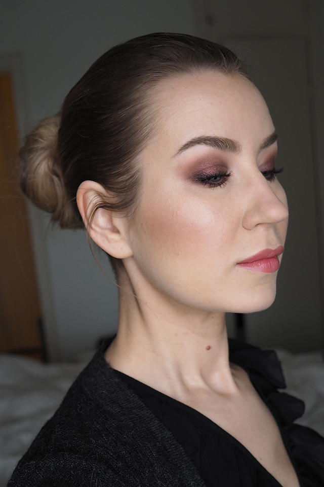 Pohjustin silmäluomet *Urban Decay Eyeshadow Primer Potion Originalilla (kuten aina). Luomiväreinä käytin *MAC Semi-Sweet Times Nine -palettia. Käytin ensin pohjalla vaaleinta sävyä (Drawing a Blanc), aloitin häivyttelyt keskirivin vasemman reunan värillä (Pink Sienna), tummensin keskimmäisellä ruskealla (Mocha Minded) ja tummimpana sävynä käytin alarivin keskimmäistä (Dance in the Dark).